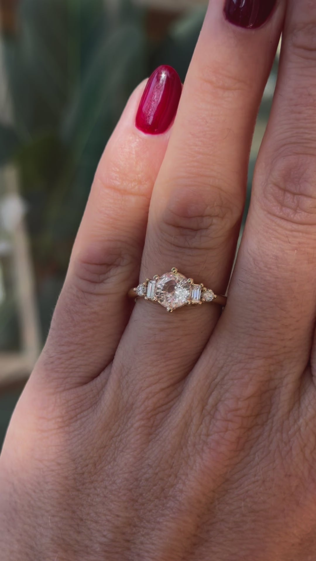 Alsea Ring | Peach Bicolor Sapphire + Baguette and Round Diamond Accent Engagement Ring 1.64 ct | 14k Recycled Gold | One of a Kind