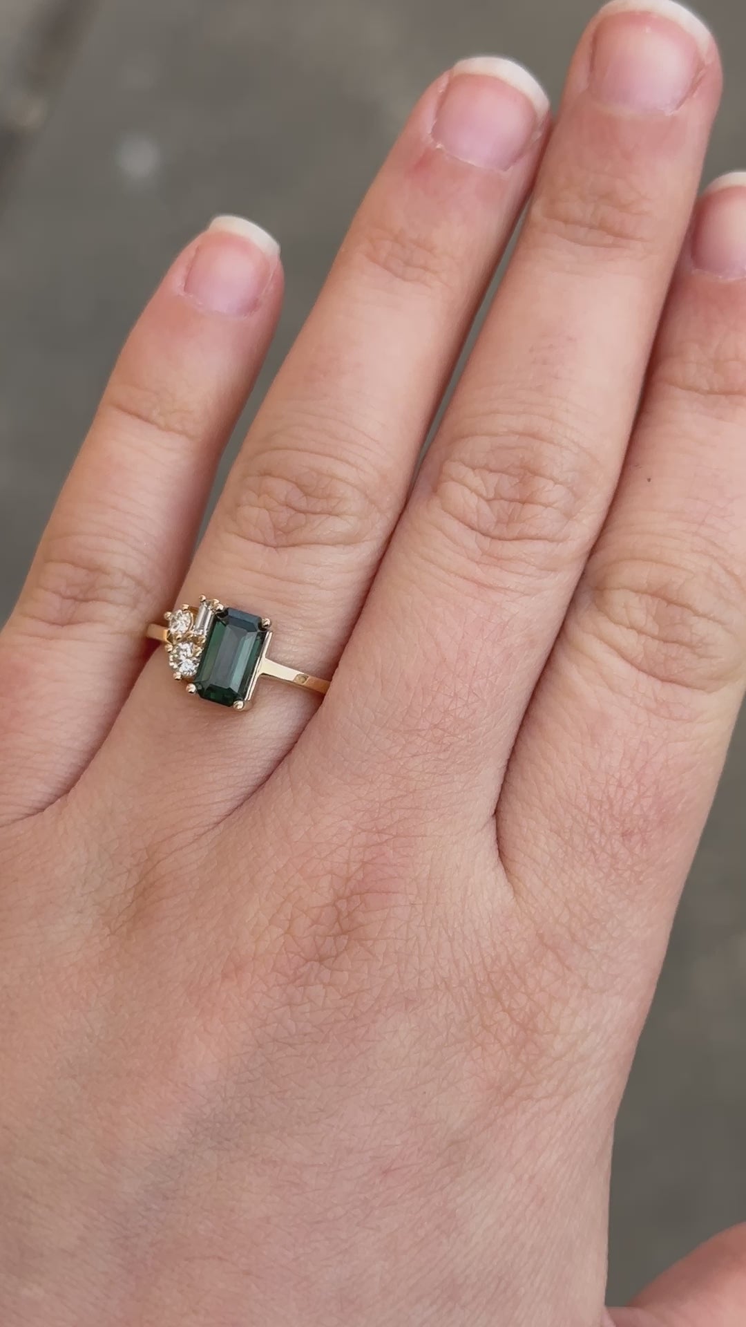 Emory Ring | Teal Sapphire + Baguette and Round Diamond Cluster Engagement Ring 1.45 ct | 14k Recycled Gold | One of a Kind