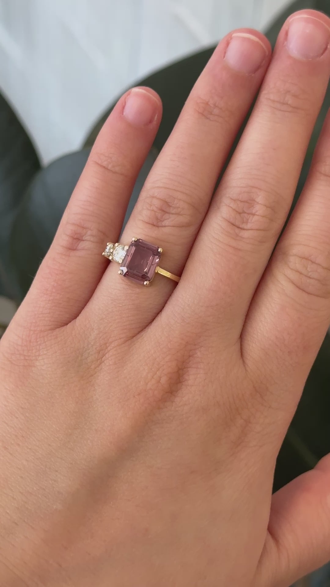 ◊ A terracotta emerald cut sapphire is accented asymmetrically with two antique diamonds.