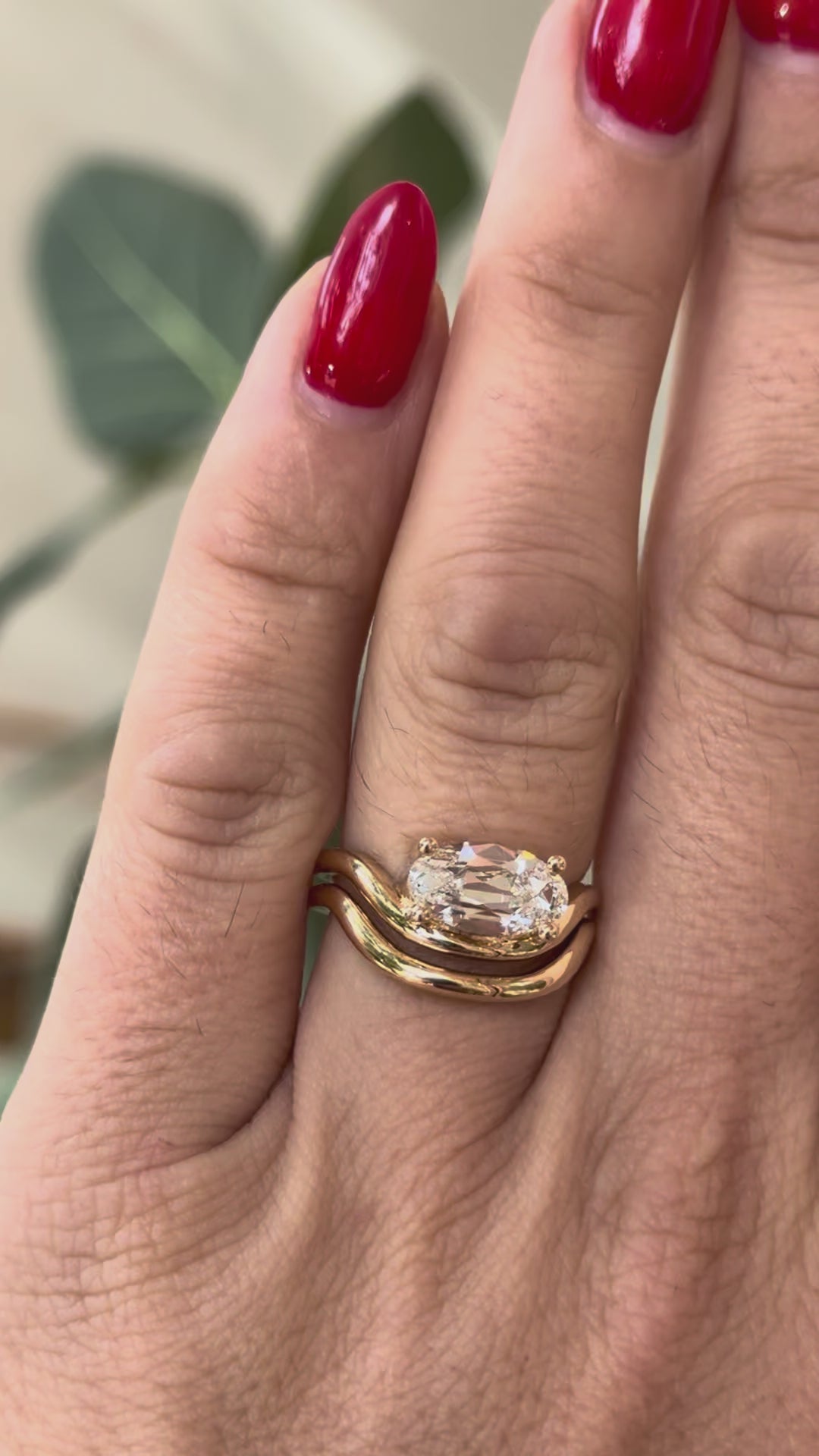 ◊ An east-west antique cut moval diamond rests within a double curved band for an elegant and modern design.
