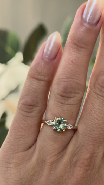◊ This green and yellow bicolor sapphire is accented with two pear diamonds to create a romantic ring.
