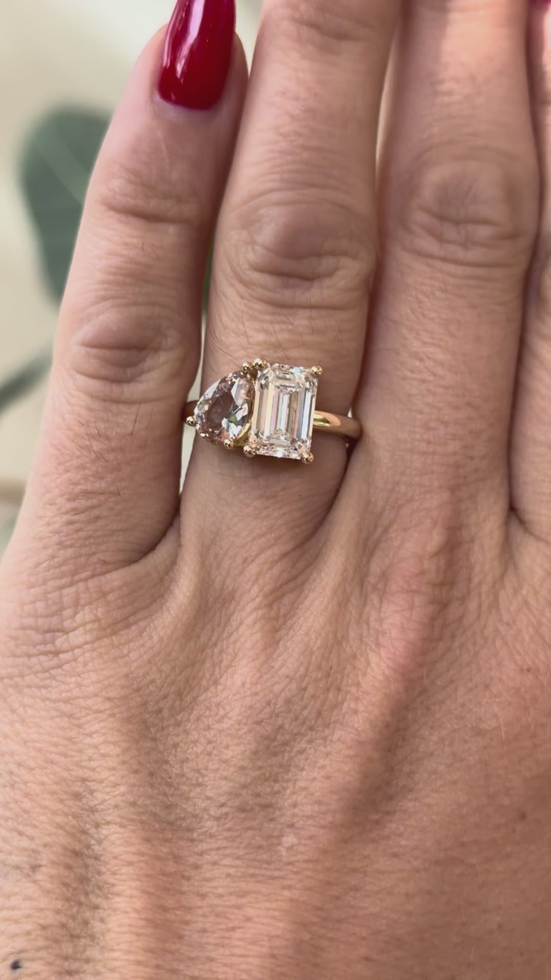 Liana Ring | Lab Emerald Cut Diamond + Pear Cut Peach Sapphire Engagement Ring 2.7 + 1.41 ct | 14k Recycled Gold | One of a Kind