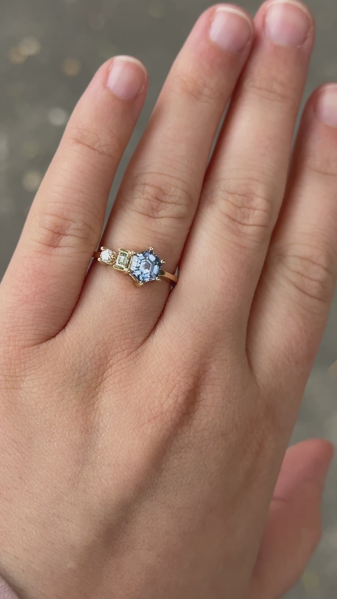 Sireli Ring | Blue Hexagon Sapphire + Diamond Cluster Engagement Ring 1.46 ct | 14k Recycled Gold | One of a Kind