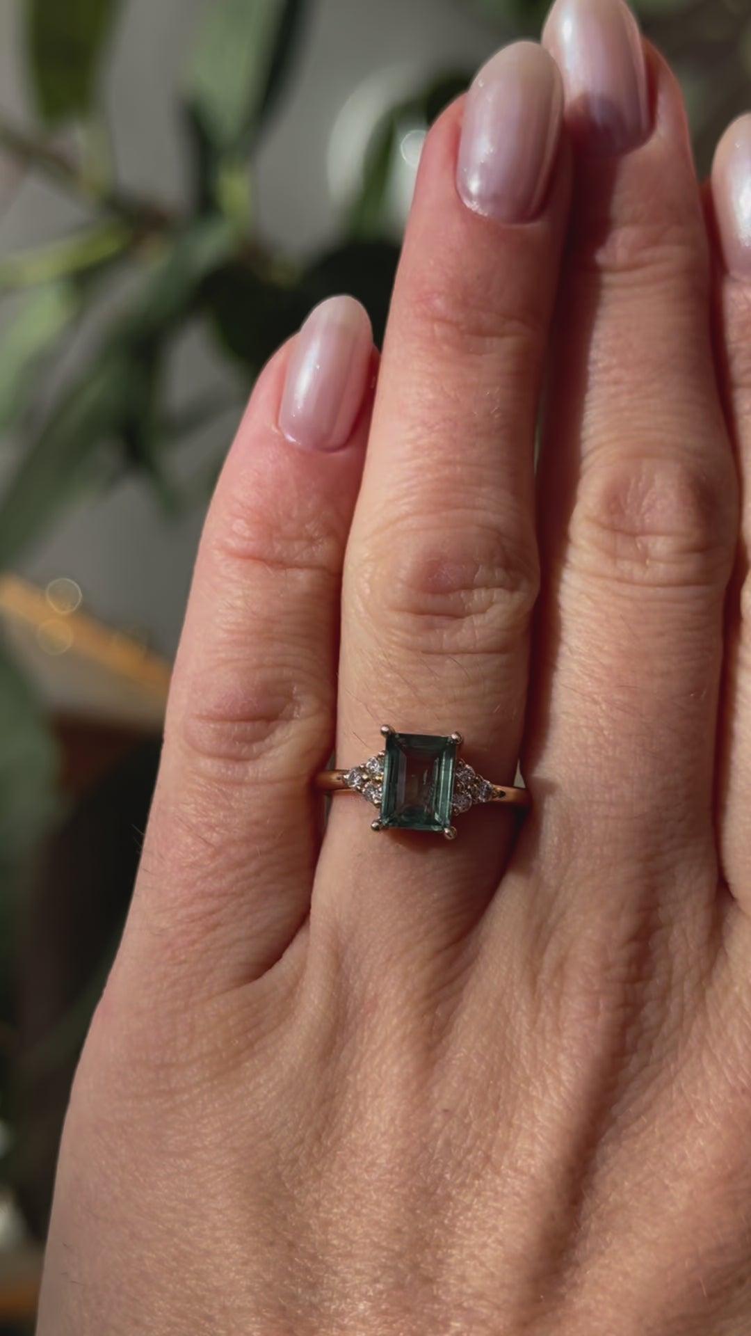 Verona Ring | Teal Baguette Cut Sapphire + Round Diamond Accents Engagement Ring 1.73 ct | 14k Recycled Gold | One of a Kind