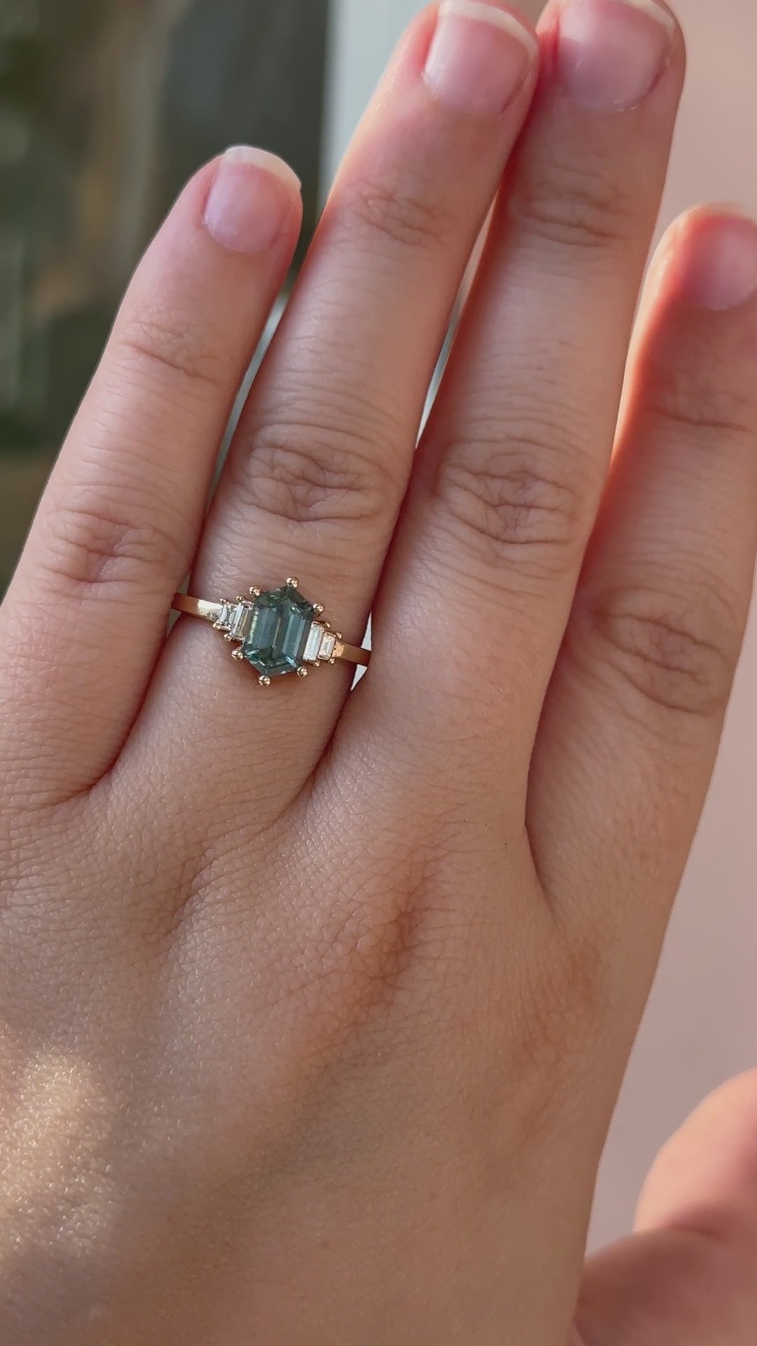 Ash Ring | Teal Hexagonal Montana Sapphire + Diamond Baguette Engagement Ring 1.54 ct | 14k Recycled Gold | One of a Kind