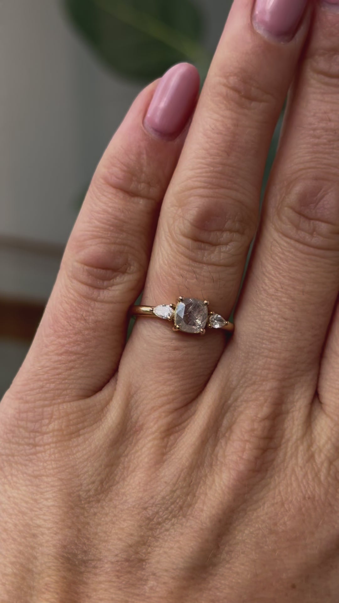 ◊ This silvery-grey cushion cut rustic natural earth mined diamond is accented with two pear diamonds to create a romantic ring.