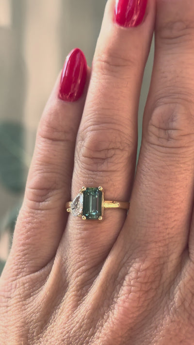 Liana Ring | Teal Emerald Cut Sapphire + Pear Cut Diamond Engagement Ring 1.75 ct | 14k Recycled Gold | One of a Kind