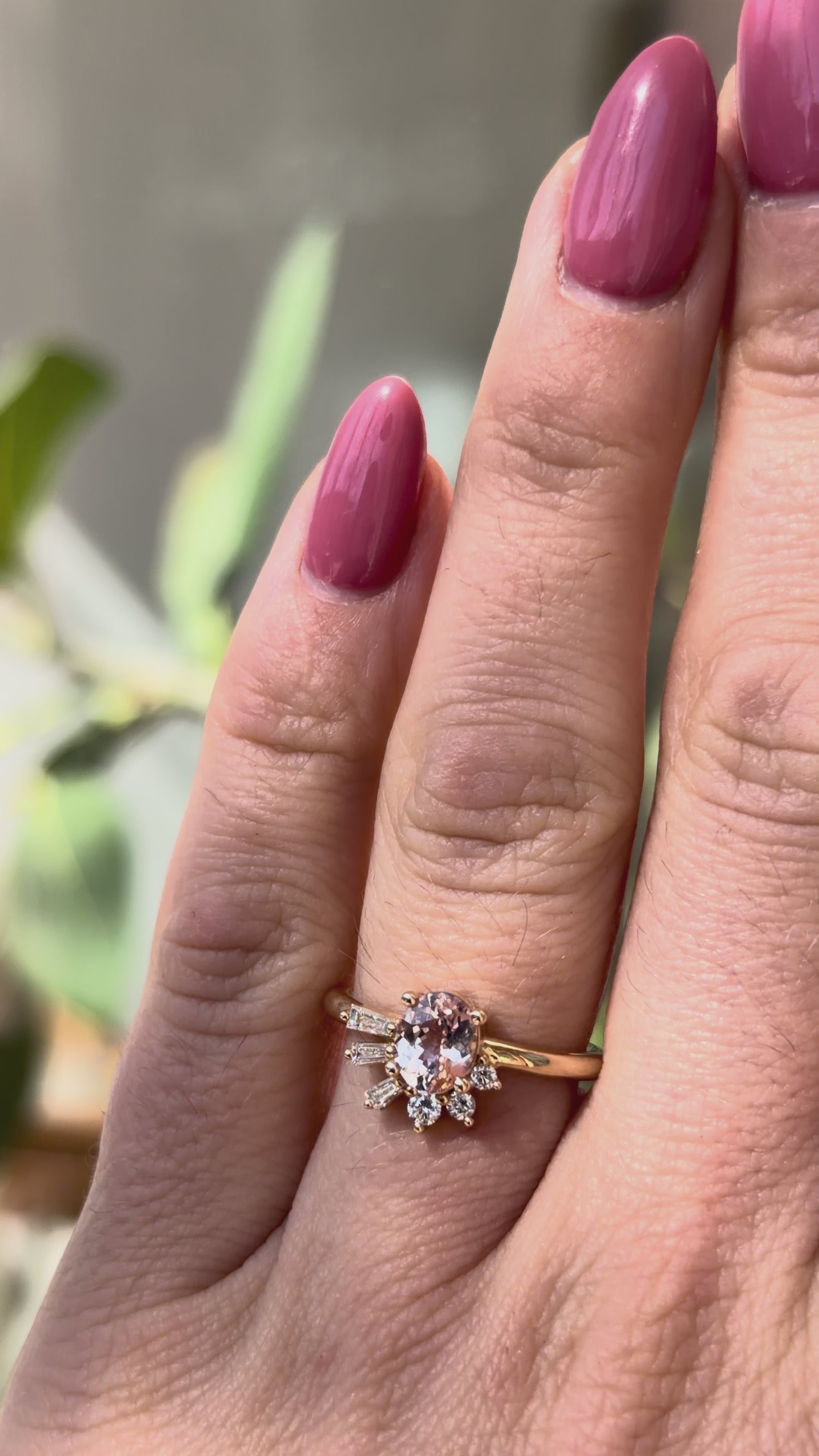 Sol Ring | Peach Oval Sapphire + Baguette and Round Diamond Cluster Engagement Ring 1.16 ct | 14k Recycled Gold | One of a Kind