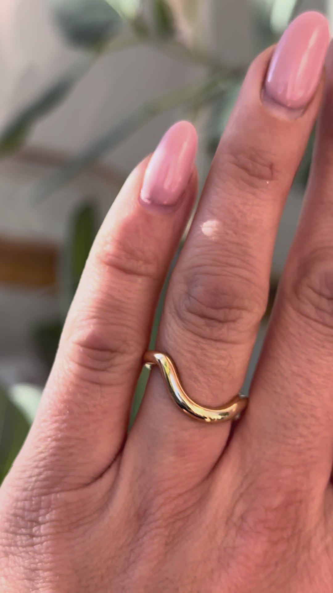 ◊ This moval cut diamond is set diagonally within a curved gold band emphasizing its shape. Designed to be stacked with its matching wedding band.