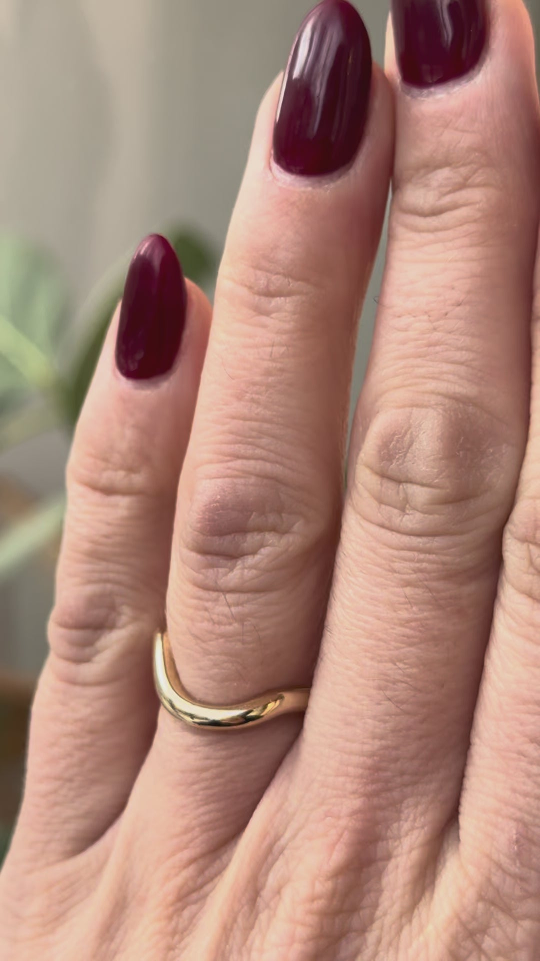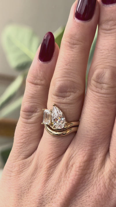 ◊ A pear and emerald cut diamond are set within a curved gold band for a unique take on a Toi et Moi ring. Designed to be stacked with its matching wedding band.