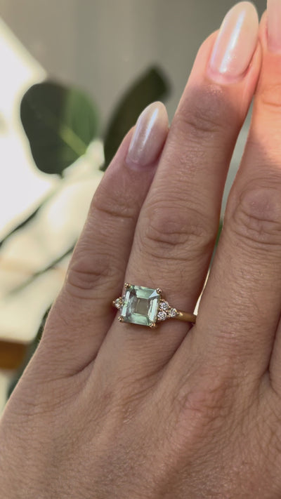 Verona Ring | Mint Asscher Cut Montana Sapphire + Round Diamond Accents Engagement Ring 2.48 ct | 14k Recycled Gold | One of a Kind